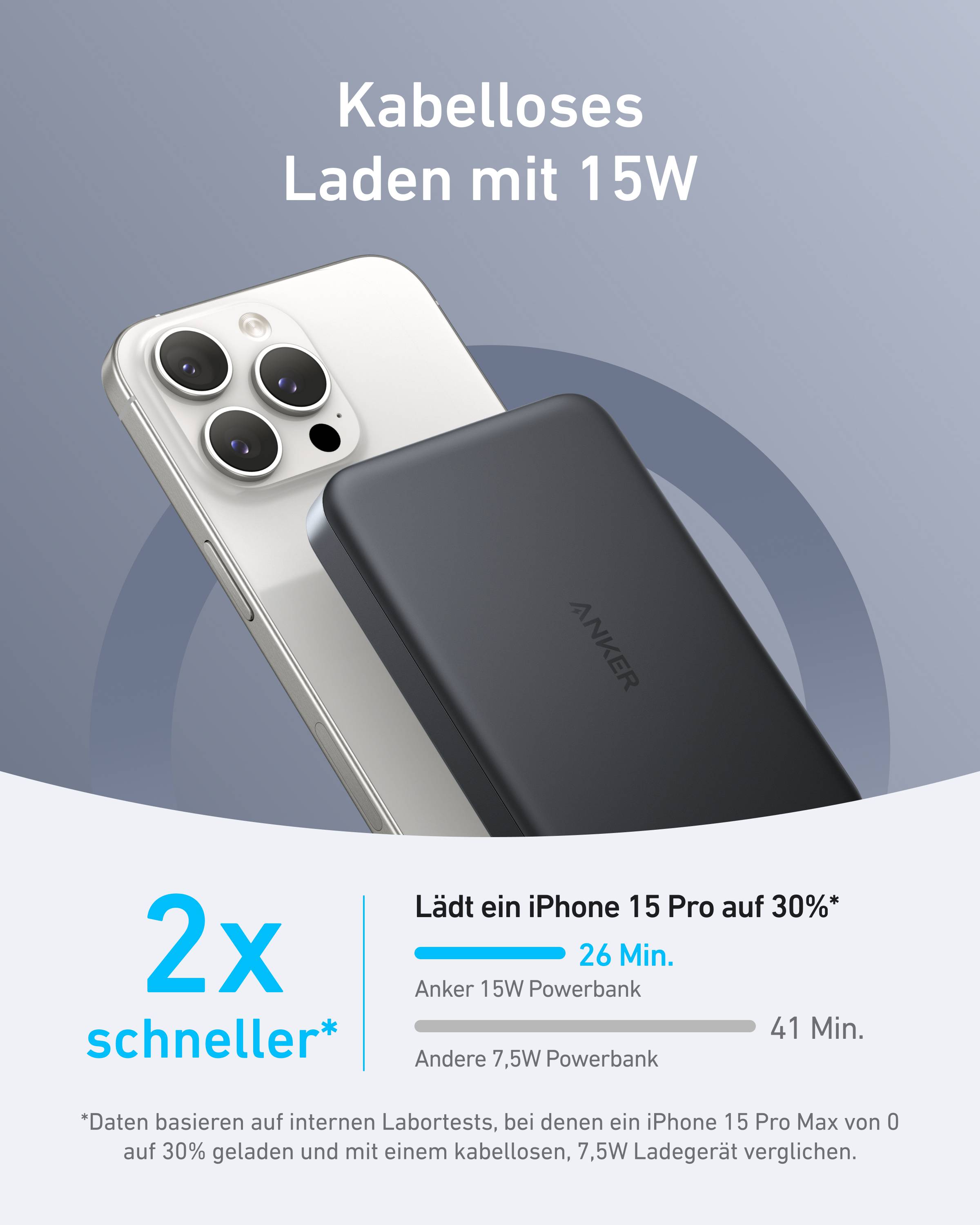 Ultra-schnelles, kabelloses Laden mit 15W: Lade deine Geräte zu jeder Zeit mit kabelloser Qi2-Technologie und 15W Leistung. In nur 51 Min. kannst du dein iPhone 15 Pro von 0 auf 50% aufladen, während der 30W USB-C-Anschluss umfangreiche Kompatibilität bietet.