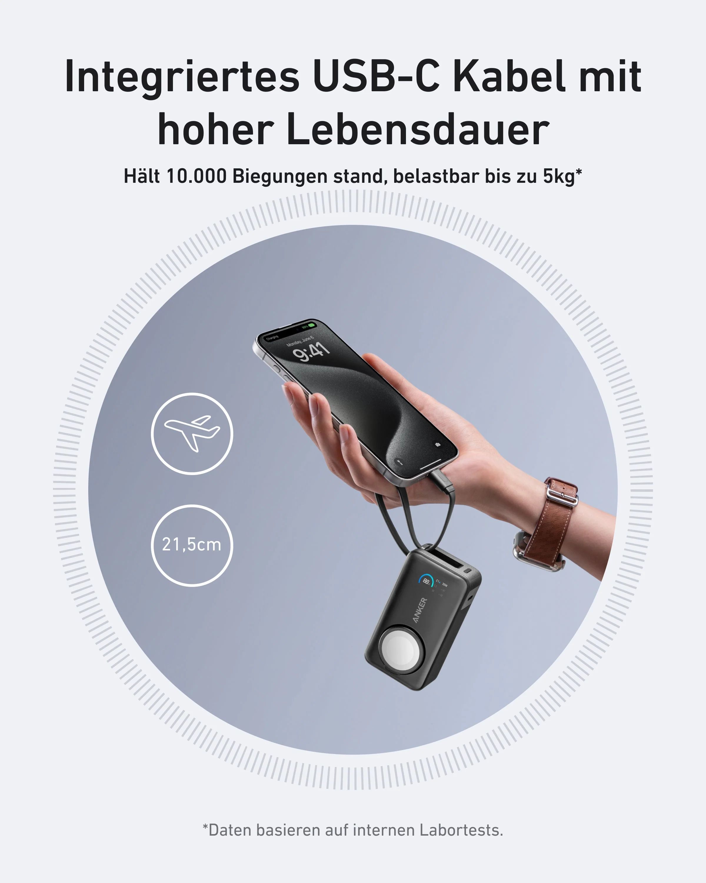 Mit diesem außergewöhnlich strapazierfähigen USB-C-Kabel bist du immer auf der sicheren Seite. Es kann über 10.000 Biegungen standhalten und sitzt auch unter starker Belastung fest.