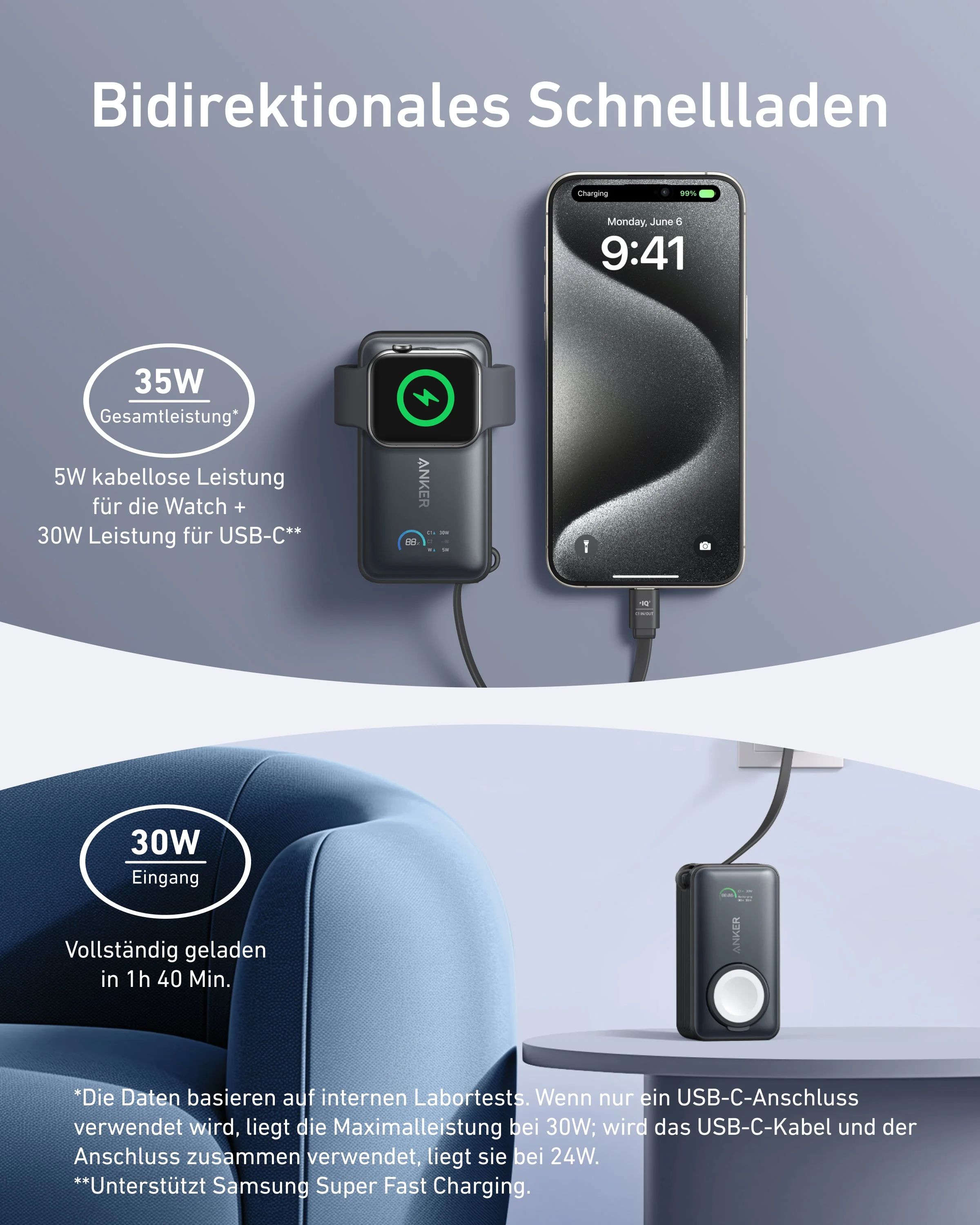 Diese praktische Powerbank bietet dir schnelles Laden über USB-C, sodass du all deine Apple-Geräte, wie dein iPhone und deine Watch, problemlos mit Strom versorgen kannst.
