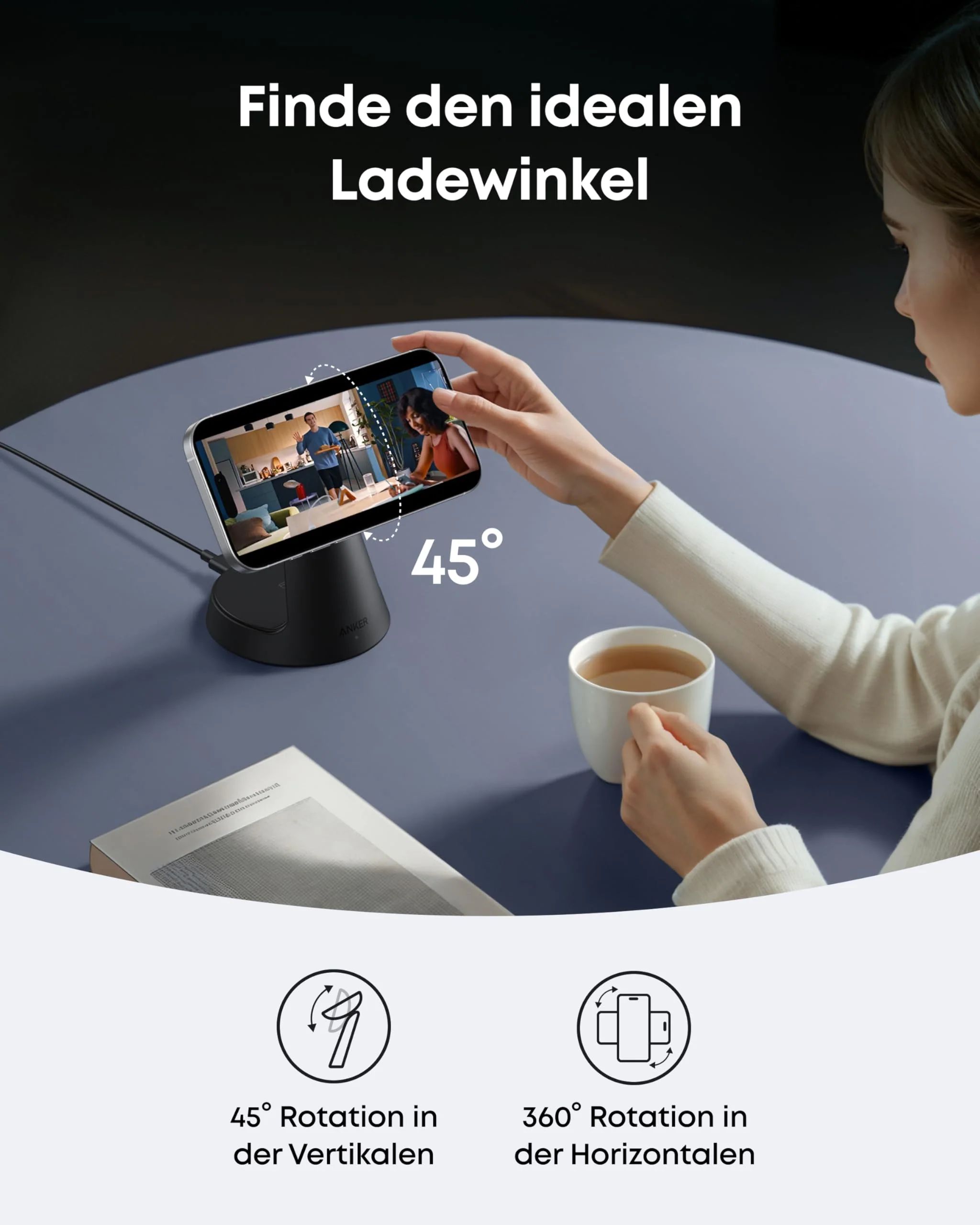 - Finde den Winkel, der zu dir passt: In der Vertikalen kann das Ladegerät um bis zu 45° verstellt werden und ist um volle 360° drehbar, sodass du stets den idealen Ladewinkel findest.