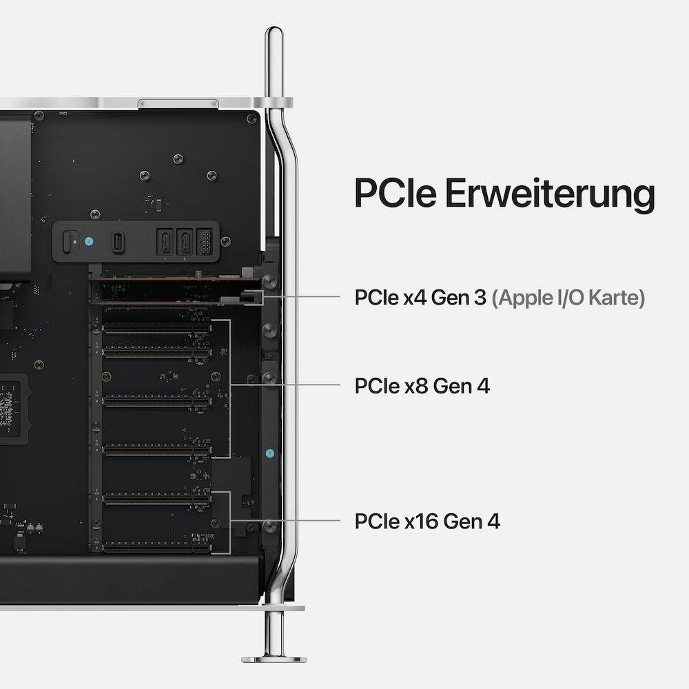 Zum ersten Mal wird die revolutionäre Performance der Apple Chips mit der Vielseitigkeit der PCI Erweiterung kombiniert. Der neue Mac Pro hat sieben Erweiterungsslots, von denen sechs PCIe Gen 4 sind – und die doppelte Bandbreite für Audio und Video I/O, Netzwerke und Speicherkarten liefern. Die neuesten PCIe Gen 4 SSD Karten ermöglichen zum Beispiel gigantische 26 GB/s.