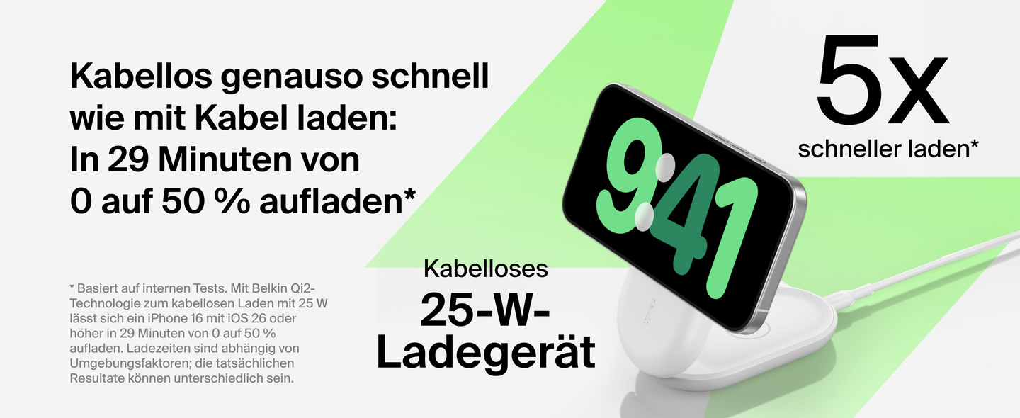 - 5x schnelleres kabelloses Laden mit bis zu 25 W
