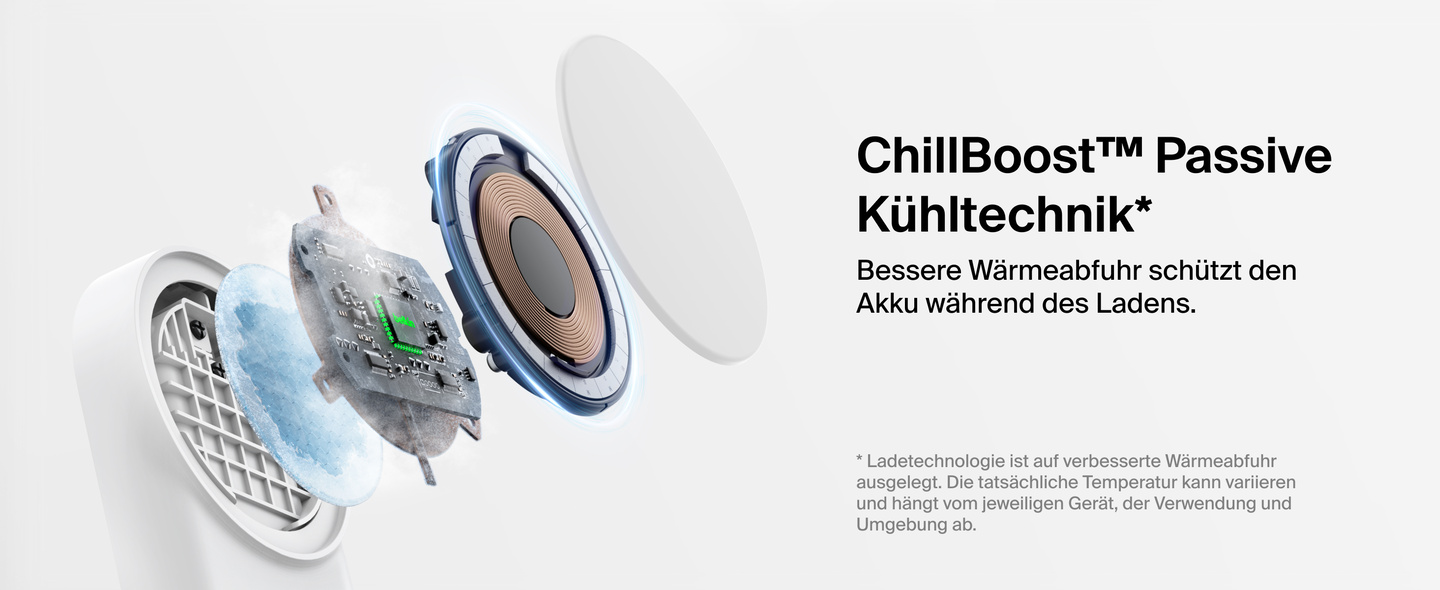 - ChillBoost™ passive Kühltechnik wurde entwickelt, um Erwärmung während des Schnellladens zu reduzieren und den Akku zu schonen