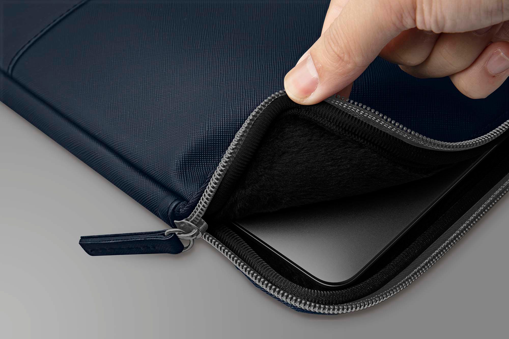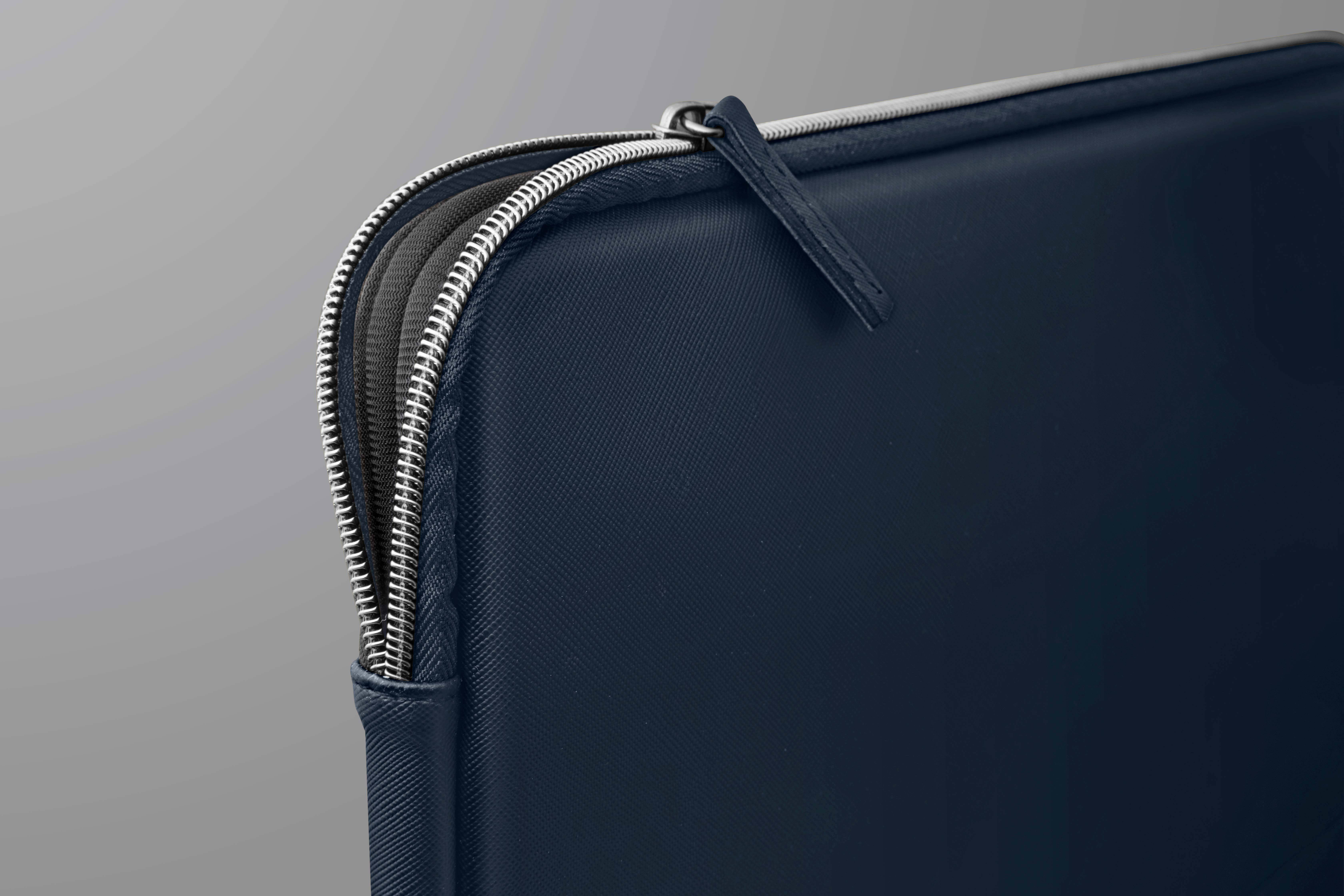 PRESTIGE MacBook Sleeve, im Kern aus hochdichtem Neopren gefertigt, mit geschmeidigem veganem Leder überzogen, bietet ein erstklassiges Gefühl und all den Schutz, den Sie jemals brauchen werden. Das ultraweiche Kunstpelzfutter im Inneren hält Ihr MacBook fest und sicher, während der interne Reißverschlussschutz dafür sorgt, dass beim Ein- und Ausziehen Ihres MacBook keine versehentlichen Kratzer entstehen. Erhältlich in luxuriösem Taupe, klassischem Schwarz oder adrettem Dunkelblau – die Prestige MacBook-Hülle sieht in jedem Szenario sensationell aus.