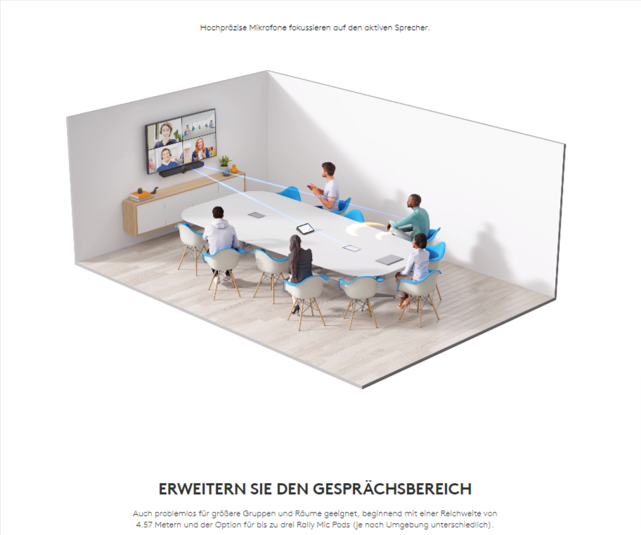 Mit Rally Mic Pods auch für den Einsatz in größeren Räumen geeignet. Die Rally Bar hat eine Aufnahmereichweite von bis zu 7 m, die sich mit bis zu drei Mic Pods erheblich erweitern lässt. MEHR ÜBER RALLY MIC PODS ERFAHREN