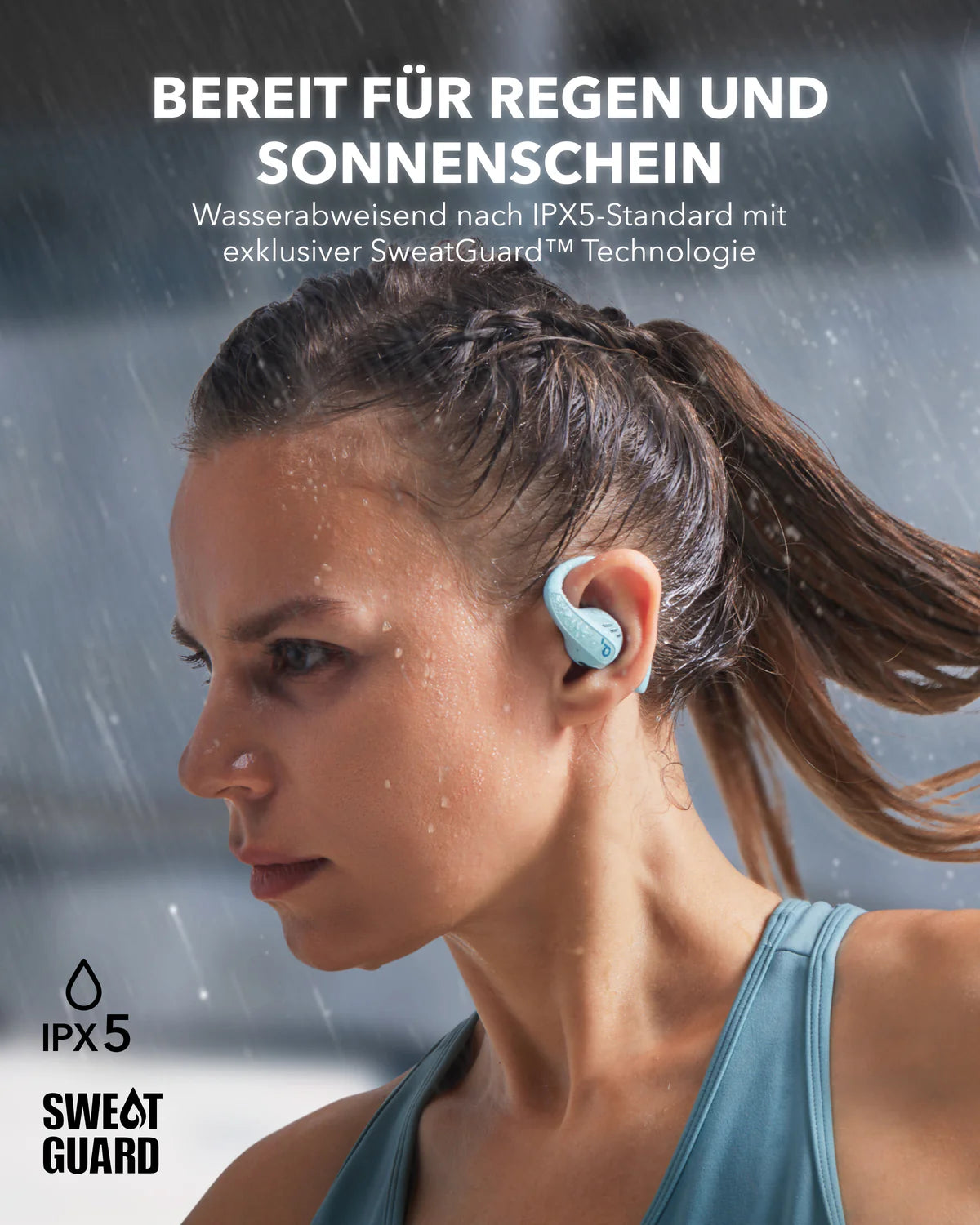Der Soundcore AeroFit Pro ist nach IPX5 wasserdicht und mit der SweatGuard-Technologie ausgestattet. Er hält intensiven Workouts und allen Wetterbedingungen stand und sorgt dafür, dass Ihre Musik nie aufhört.