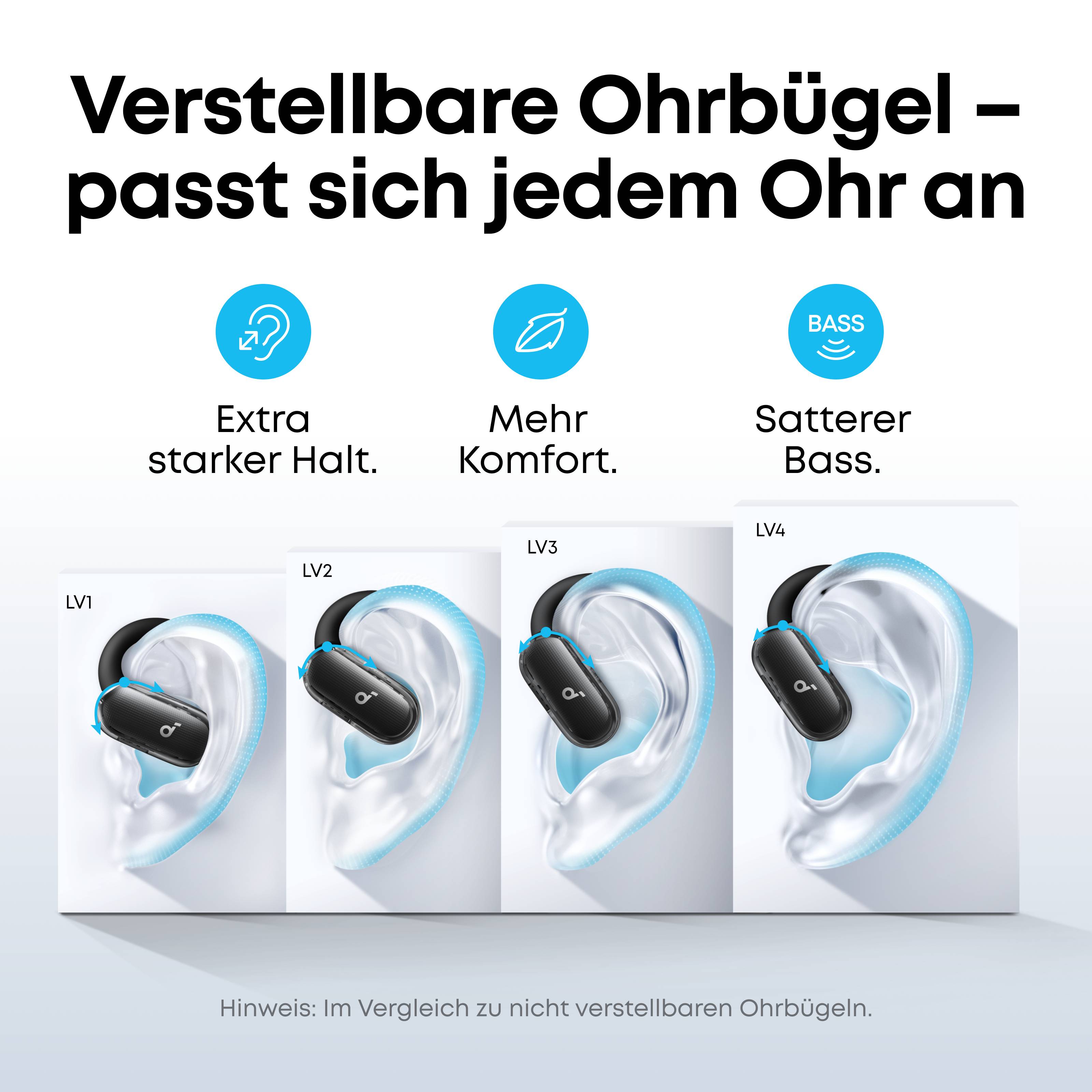 Die innovativen, 4-fach verstellbaren Ohrbügel von soundcore passen sich individuell an – für sicheren und bequemen Sitz bei 99% aller Ohrformen und -größen.