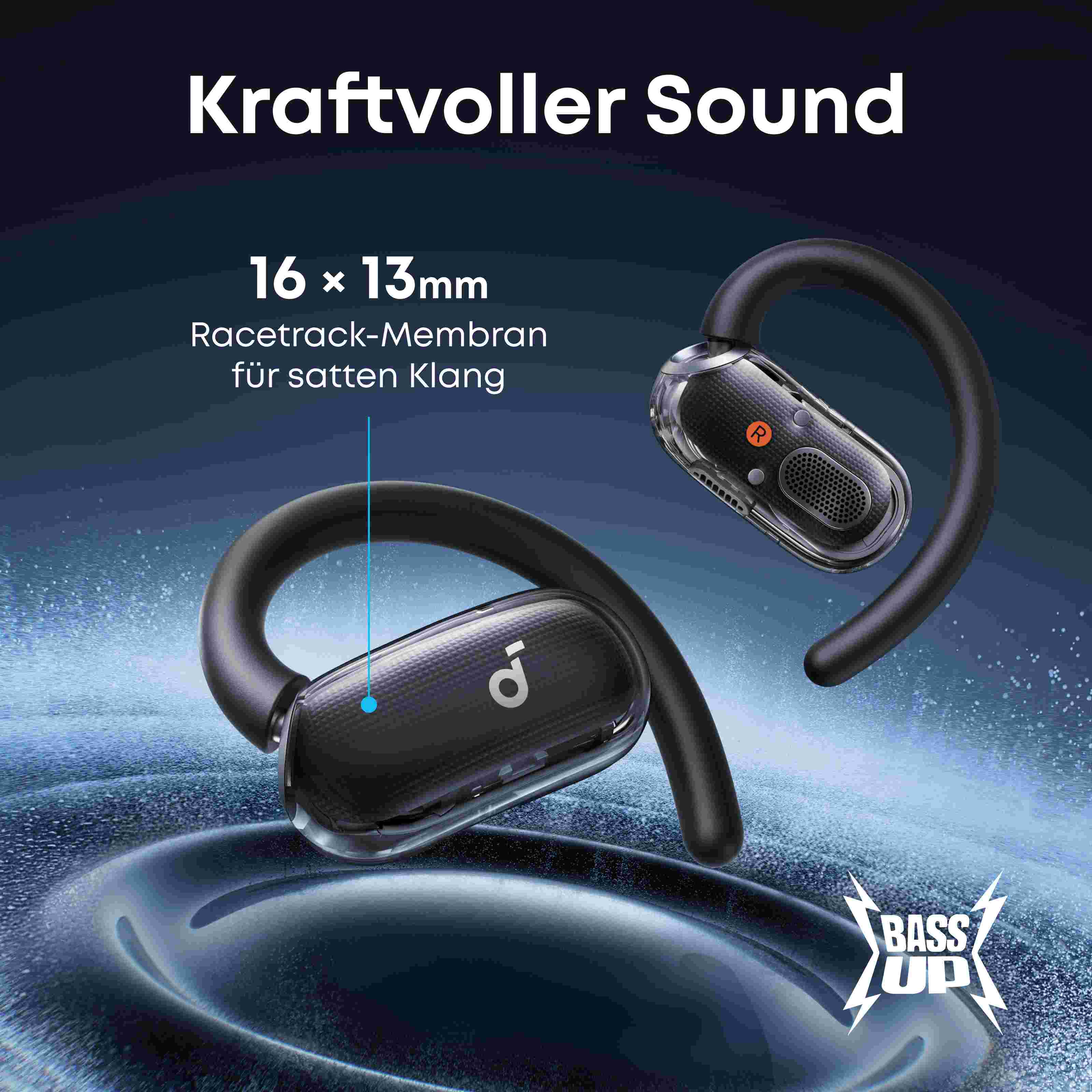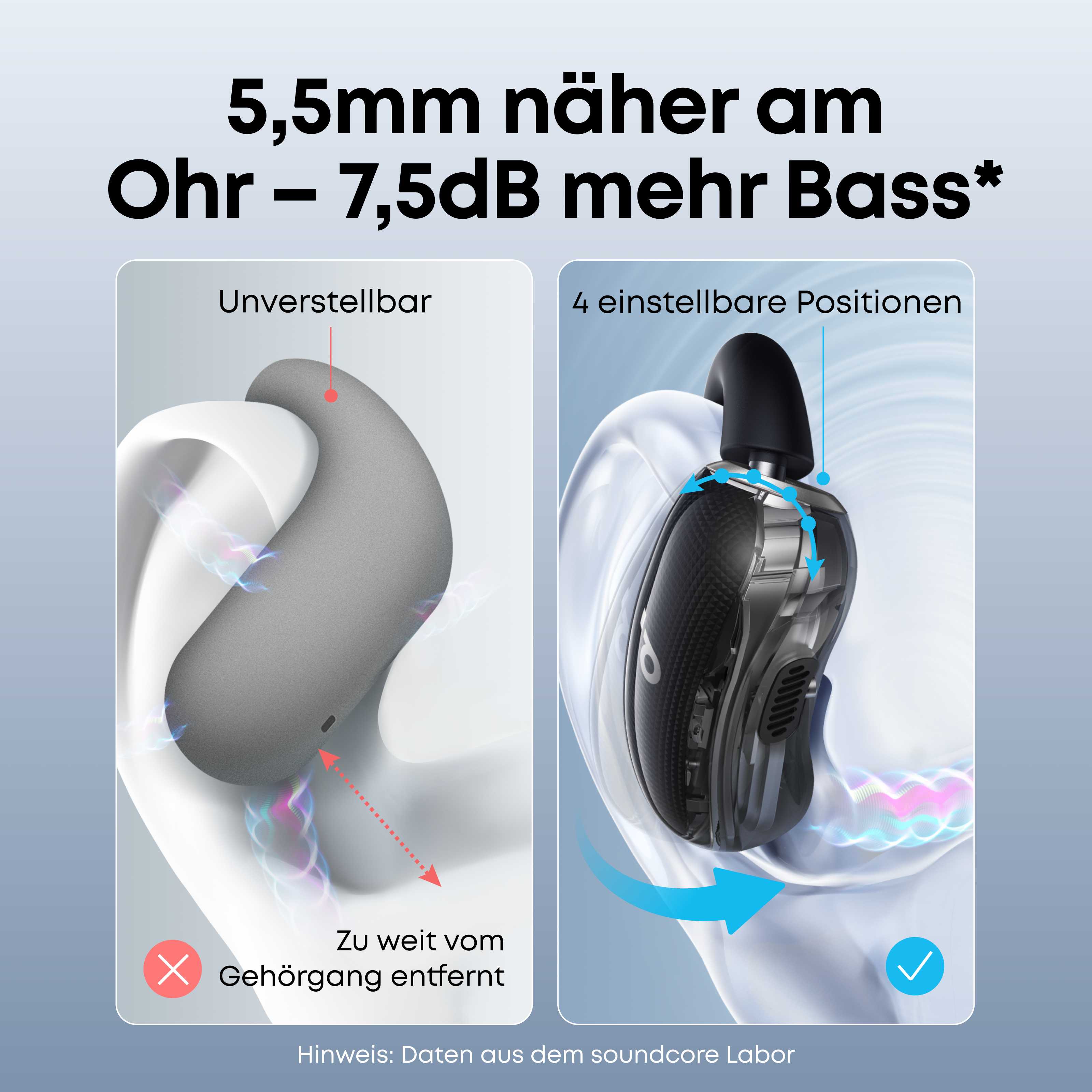 Durch die verstellbaren Ohrbügel liegt der Sound näher am Ohr für einen bis zu 8,2dB satten und kraftvollen Beat – 2x stärker als bei nicht-verstellbaren Ohrbügeln. Hinweis: Daten aus dem soundcore Labor.