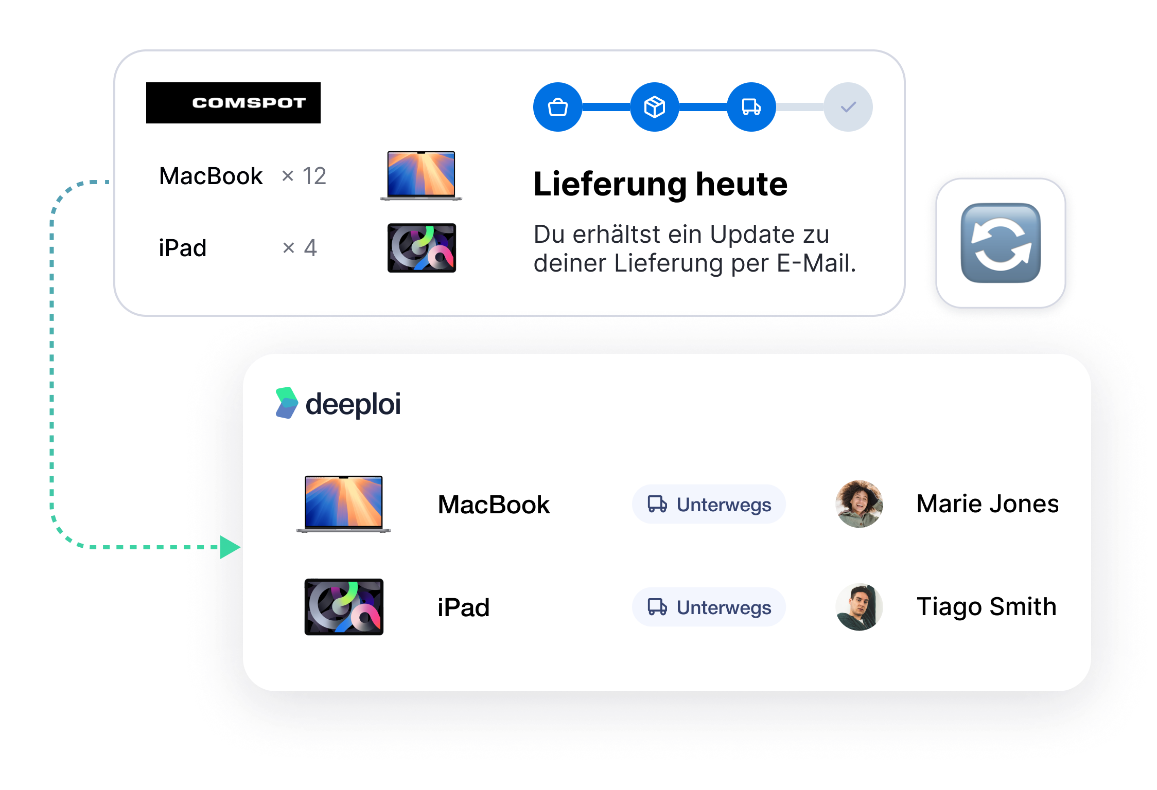 Statt verspäteter Lieferungen, fehlender Transparenz und manuellem Excel-Chaos bündelst Du mit deeploi und COMSPOT Dein komplettes IT-Management an einem Ort. Du bestellst Geräte, verfolgst Lieferungen und siehst jederzeit, welche Hardware welchen neuen Mitarbeitenden zugewiesen ist – inklusive Apps, Accounts und Sicherheitsrichtlinien. So wird aus kompliziertem IT-Management ein reibungsloser Prozess, der einfach funktioniert.