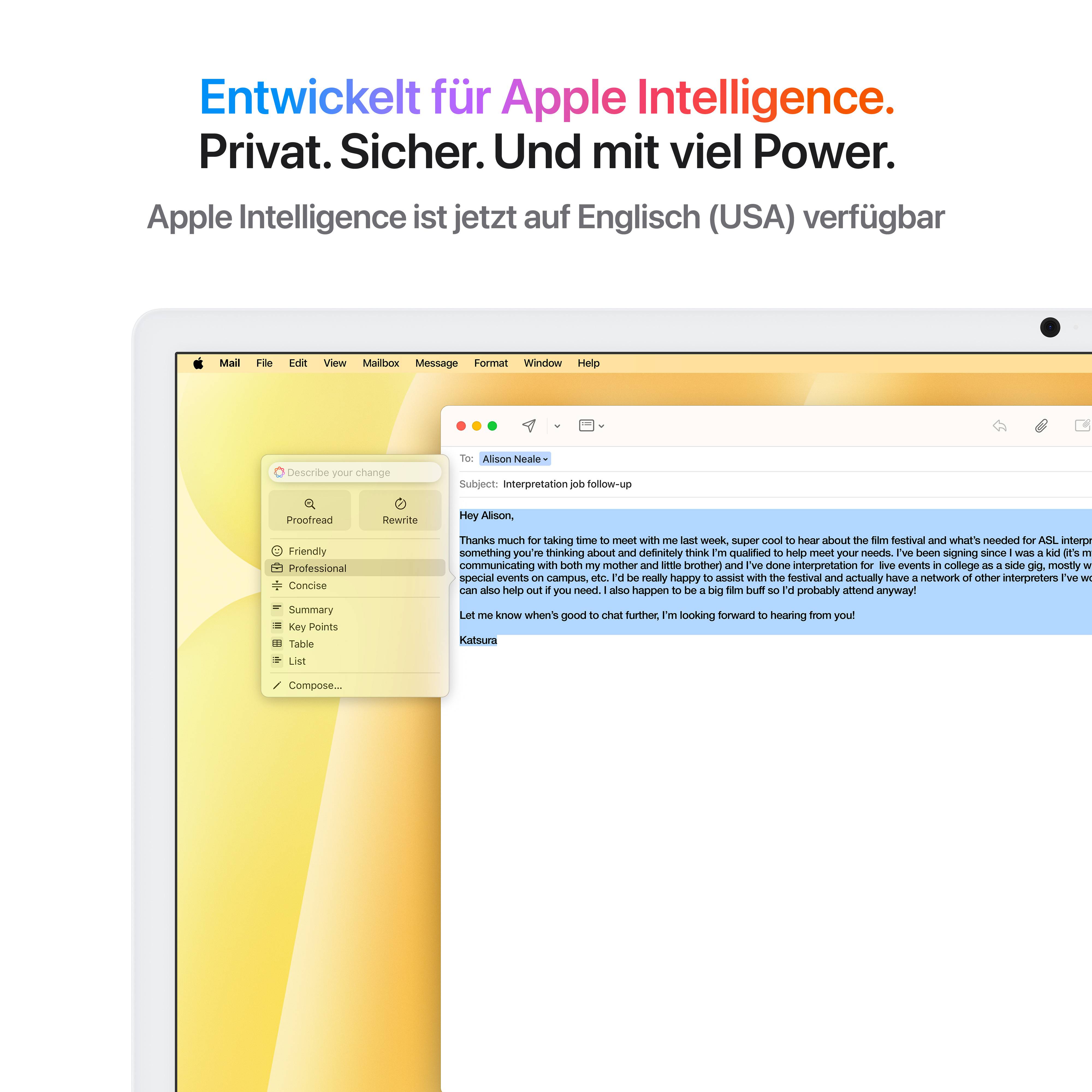 • MIT DER POWER DES M4 – Erledige mehr in weniger Zeit, mit dem Apple M4 Chip. Er sorgt dafür, dass alles absolut flüssig läuft – vom Bearbeiten von Fotos über das Erstellen von Präsentationen bis hin zum Gaming.