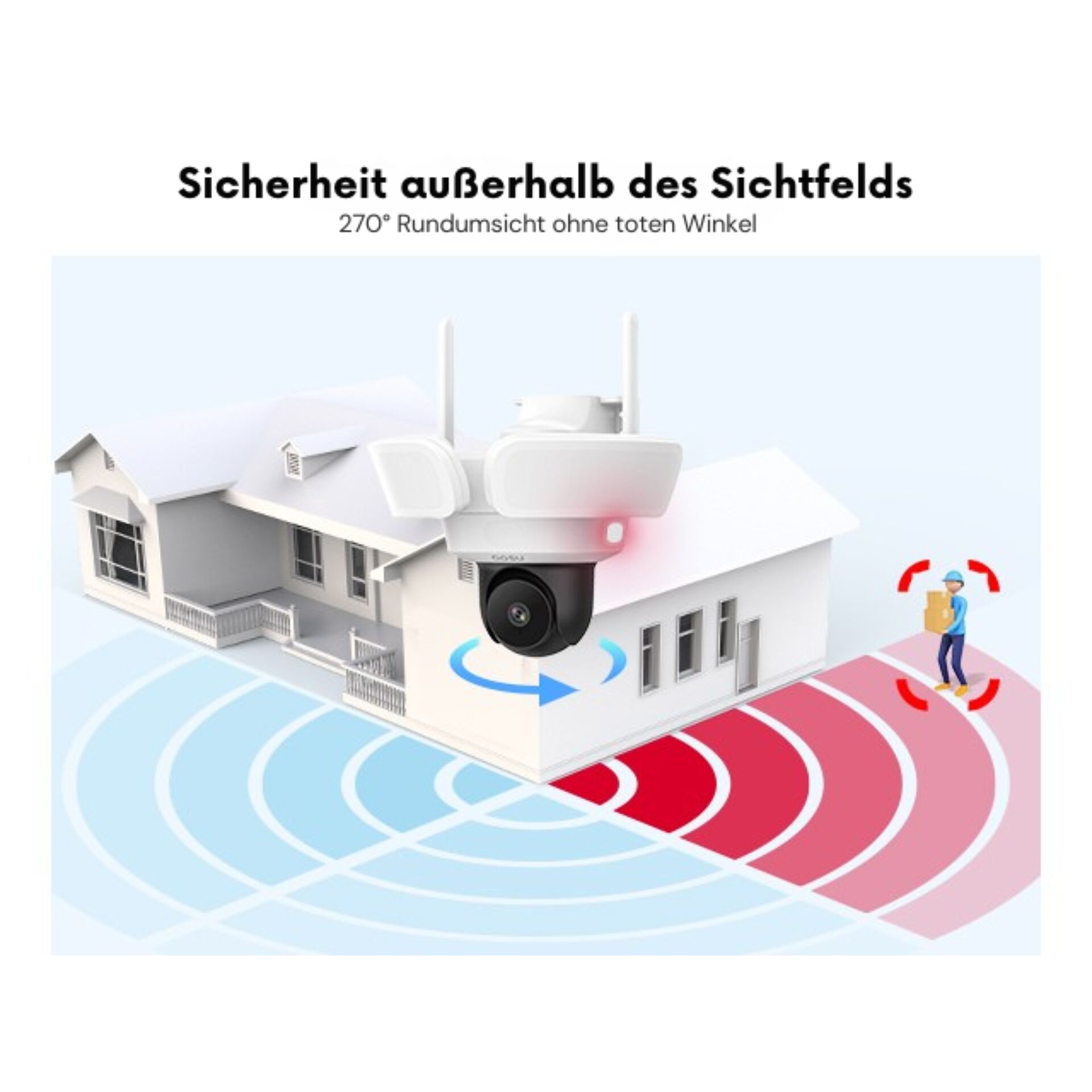 - Drei Passiv-Infrarot-Sensoren (PIR-Sensoren) mit 270°-Bewegungserkennung zur vollflächigen Abdeckung