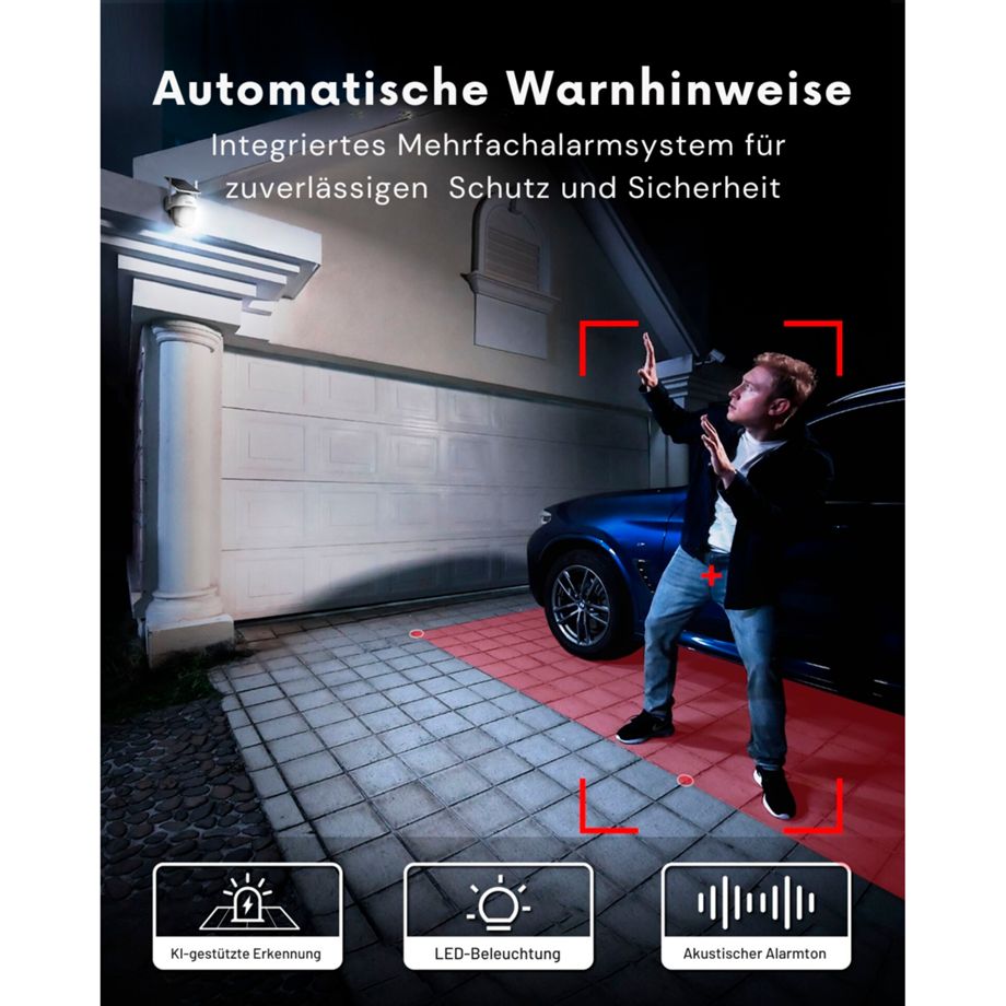 - Integrierter LED-Spot und akustisches Alarmsystem zur Abschreckung unbefugter Personen