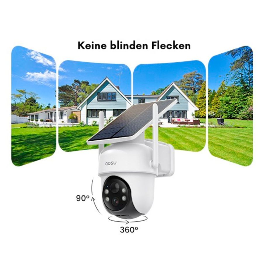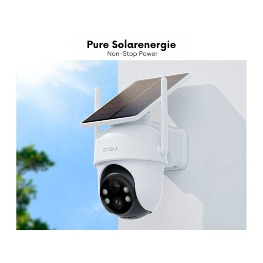 Die aosu SolarCam D1 Classic ist eine vollständig schwenk- und neigbare Außenkamera mit 2K-Auflösung und 360°-Rundumsicht, integriertem Solarpanel und KI-gestützter Objekterkennung. Sie ermöglicht eine lückenlose Überwachung im Außenbereich, erkennt Personen automatisch und verfolgt Bewegungen in Echtzeit.
