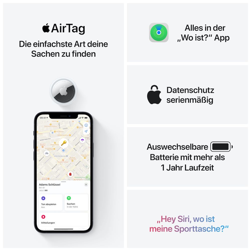 AirTag ist eine super einfache Art, Deine Sachen im Blick zu behalten. Mach eins an Deine Schlüssel, steck ein anderes in deinen Rucksack. Und schon sind sie in der „Wo ist?“ App auf deinem Radar, wo Du auch deine Apple Geräte finden und mit Deinen Freund:innen und deiner Familie in Verbindung bleiben kannst.Ping. Da ist es.