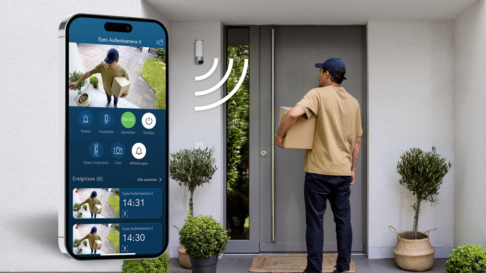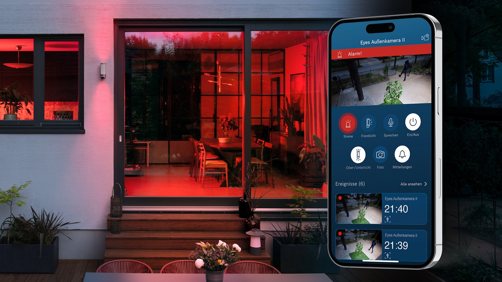 Dank smarter Videoanalyse und 3D-Bewegungserkennung erkennt sie menschliche Bewegung und reagiert so nur bei relevanten Ereignissen innerhalb der benutzerdefinierten Bewegungszonen. Dabei zeichnet sie Full-HD-Farbvideos auf – durch integrierte Beleuchtung auch bei Nacht. Sie werden umgehend per Push-Nachricht informiert und sehen im Livestream, was vor sich geht. Mithilfe der Gegensprechfunktion können Sie über Ihr Smartphone mit den Personen vor der Kamera kommunizieren. Zudem schlägt sie Einbrecher im Ernstfall in die Flucht: Ein Fingertipp genügt, um lautstark über die Sirene Alarm auszulösen und die farbigen Ober- und Unterlichter auffallend rot blinken zu lassen.
