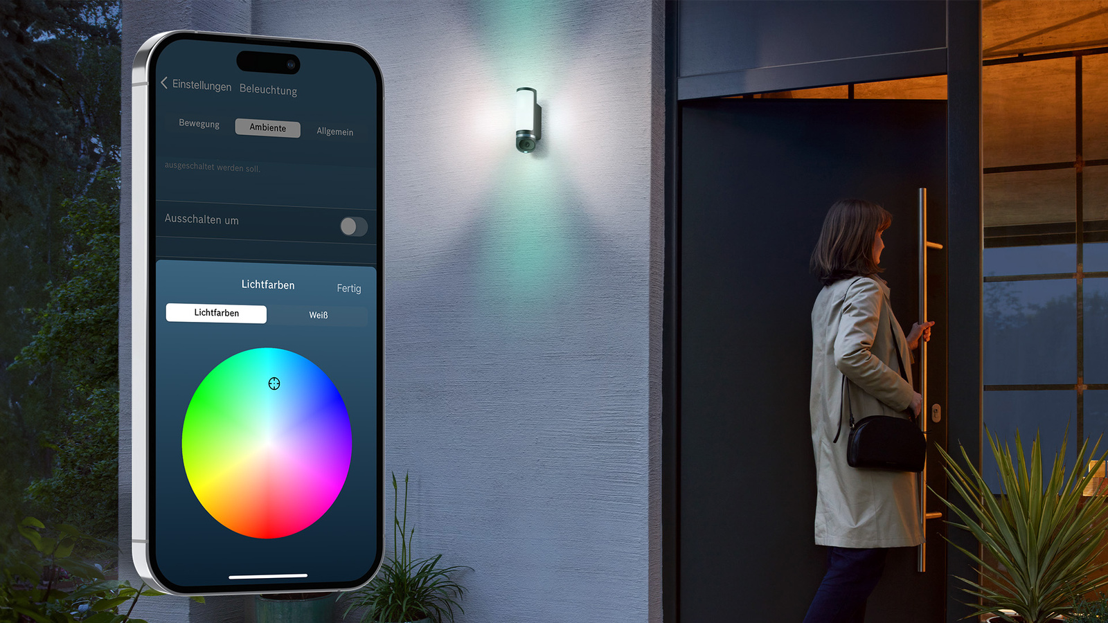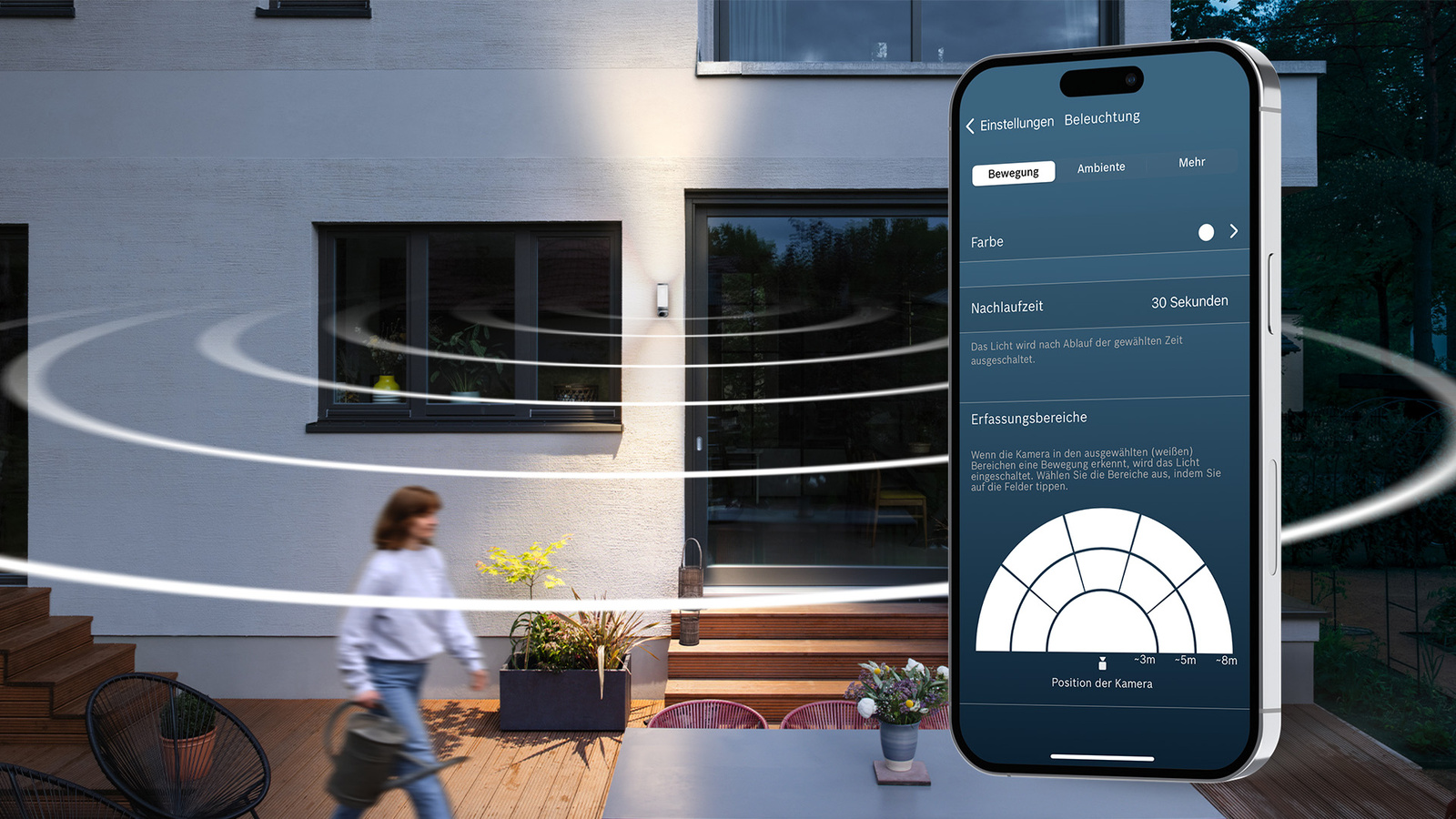Zusätzlich ist die smarte Außenkamera eine stimmungsvolle Außenbeleuchtung. Die Frontlampe in Kalt-/Warmweiß sowie die Ober- und Unterlichter in über 1500 Farben lassen sich einzeln schalten und dimmen. Per Bewegungslicht erstrahlen die Leuchten zudem automatisch, sobald die 180° DualRadar-Sensoren Bewegung erkennen – wahlweise mit sanftem Lichtstart oder direkt abschreckend hell.