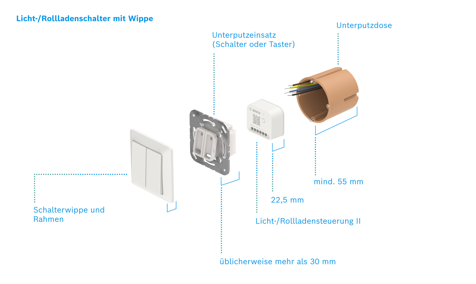- Bestehende Wandschalter/ Taster können weiterhin genutzt werden - ohne zusätzliche Adapter. Bei der Installation in einer Verteilerdose wird kein Schalter benötigt.