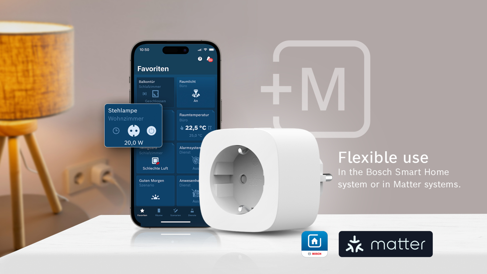 Mit dem Zwischenstecker kompakt [+M] lassen sich nicht-smarte Elektrogeräte einfach ins Bosch Smart Home System einbinden und komfortabel direkt am Gerät, über einen Sprachbefehl oder per App bedienen. Er ist flexibel nutzbar: mit dem Bosch Smart Home Controller im Bosch Smart Home System oder ohne Controller in jedem Matter System* (über Thread). Welches System genutzt wird, kann bei der Installation am Gerät ausgewählt und bei Bedarf wieder geändert werden. Dabei verstärkt der Zwischenstecker kompakt [+M] das Funksignal sowohl im Bosch Smart Home als auch in Matter Systemen* (über Thread) und erweitert so die Reichweite im Smart Home.