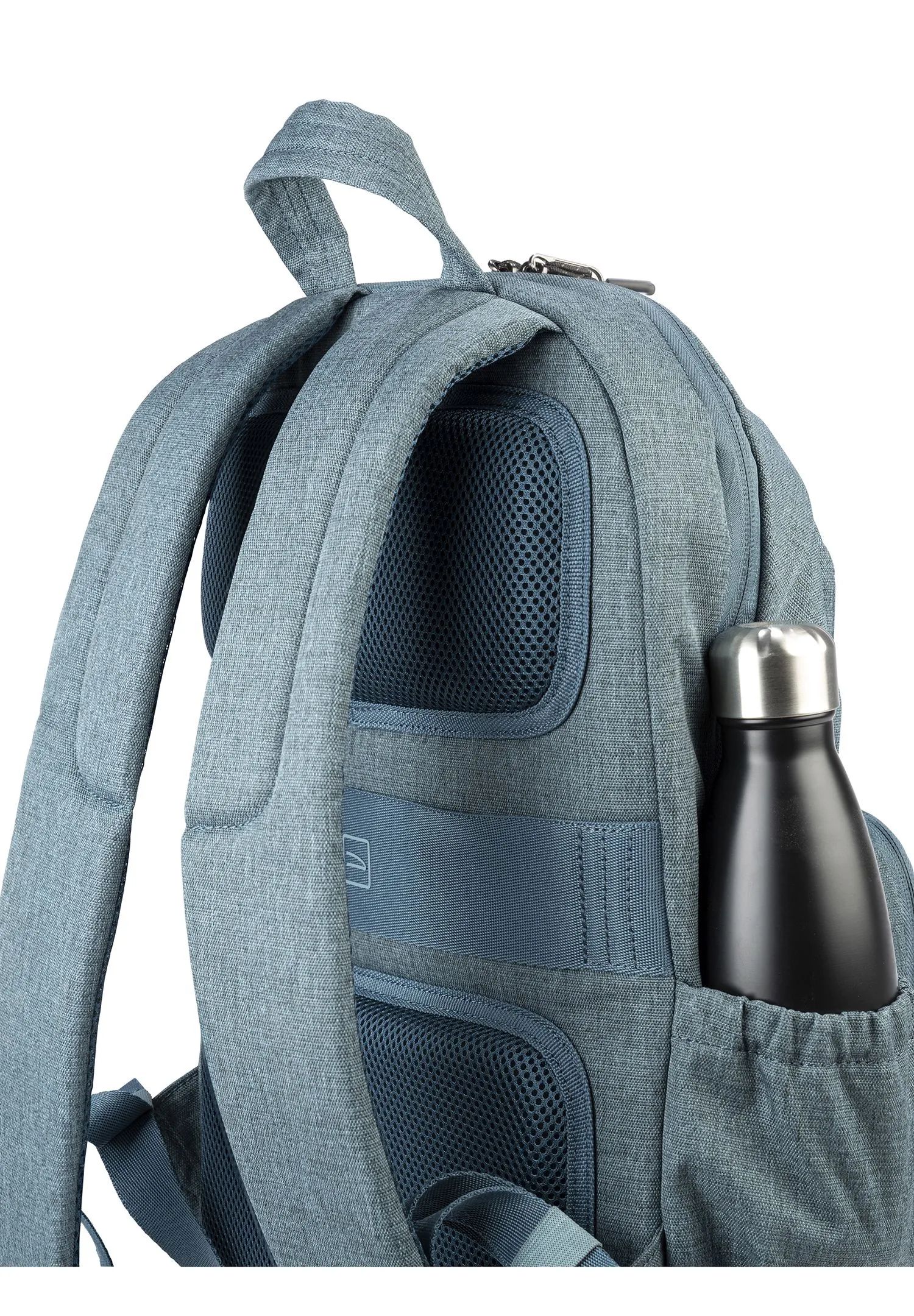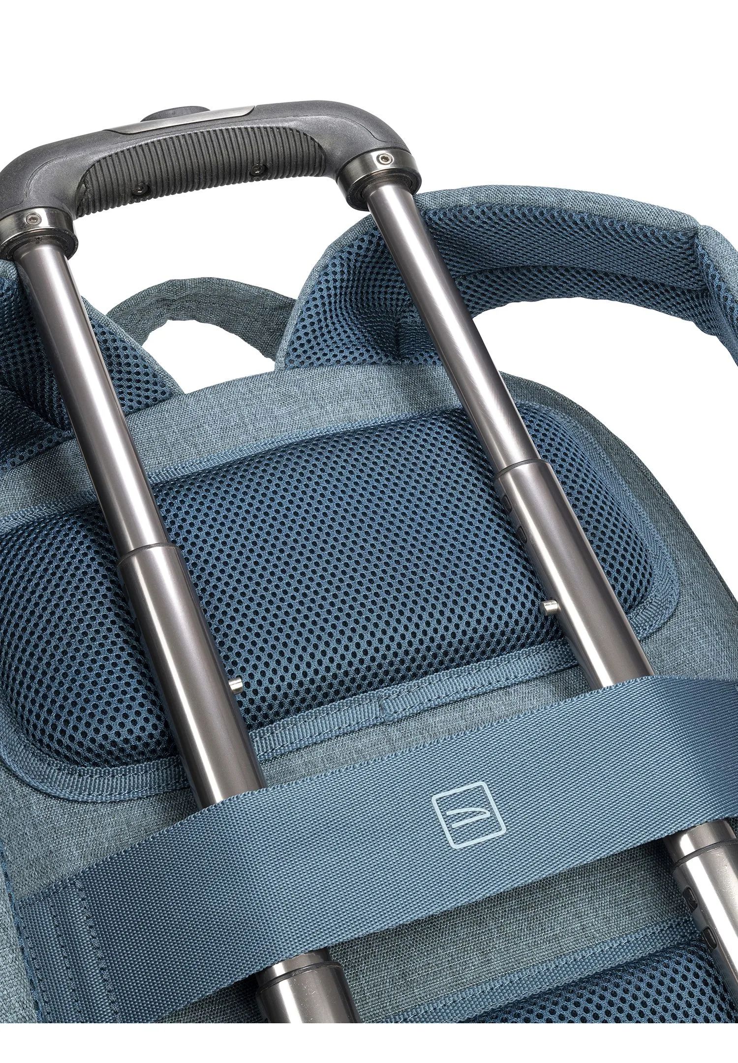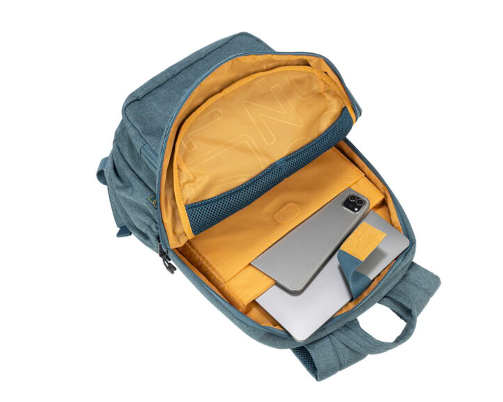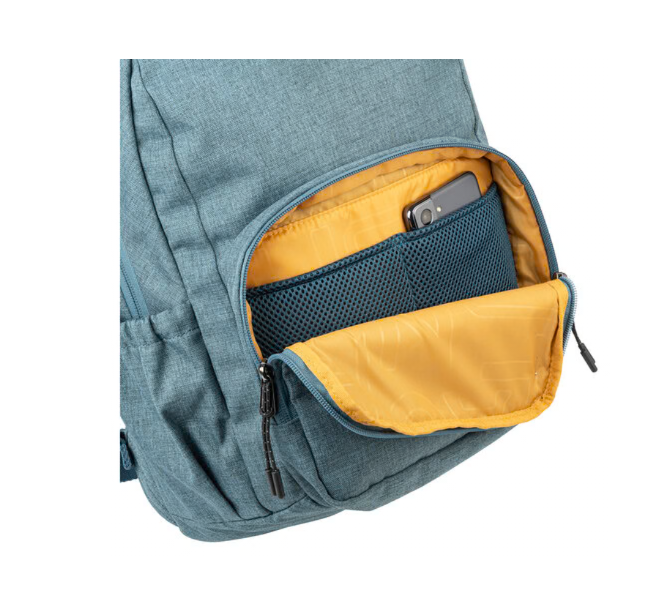 Der Rucksack besteht aus Stoff aus recyceltem Kunststoff. Der Innenraum mit kontrastfarbigem Futter verfügt über eine doppelte Schutztasche für Laptop und Tablet. Auf der Vorderseite befindet sich eine Vordertasche mit Zubehör und auf der Rückseite sind verstellbare Schultergurte sowie ein Trolley-Befestigungsband angebracht. An der Seite hat der Rucksack zwei praktische Taschen für einen Regenschirm und eine Wasserflasche.