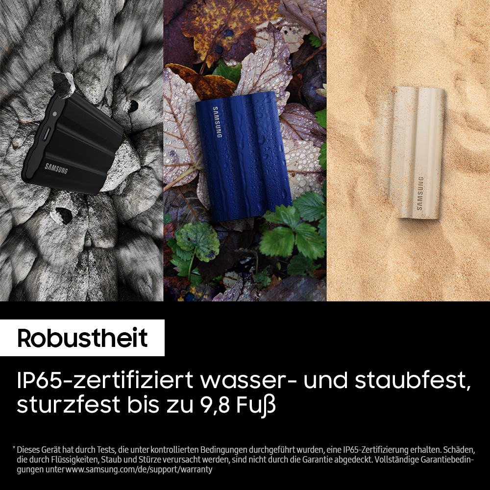 Dank USB 3.2 Gen. 2 und PCIe® NVMe™ erreichst Du auch hier Übertragungsraten von bis zu 1.050 MB/s. Zusätzlich ist die T7 Shield gemäß IP65 gegen Wasser und Staub geschützt und übersteht Stürze aus bis zu 3 Metern Höhe – perfekt für Outdoor-Einsätze, Reisen oder mobile Arbeitsplätze.