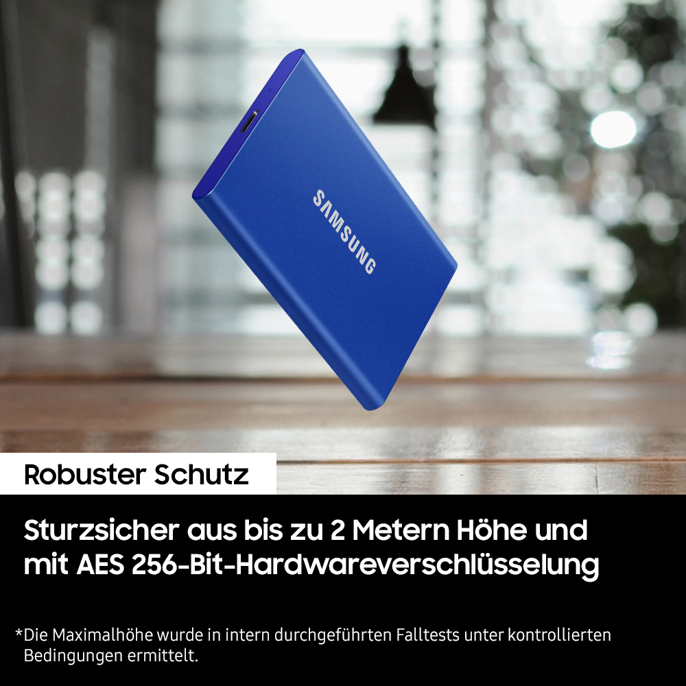 Mit ihrem schlanken Aluminiumgehäuse ist die T7 kaum größer als eine Kreditkarte, angenehm leicht und dabei robust genug, um Stürze aus bis zu 2 Metern Höhe zu überstehen. Deine Daten schützt Du bei Bedarf zusätzlich mit einer AES-256-Bit-Hardware-Verschlüsselung und optionalem Passwort.